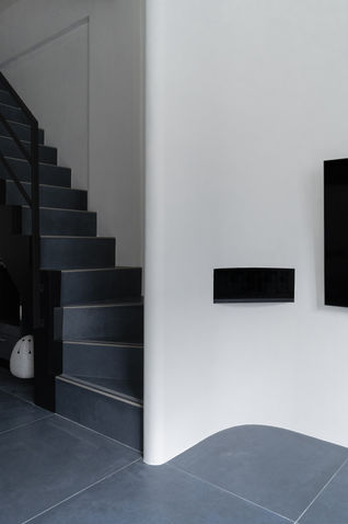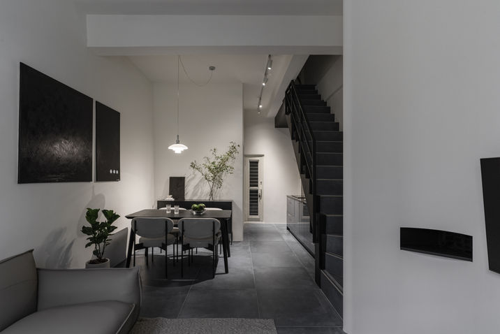 ・本案為透天厝,以黛藍色與黑色作為空間主軸,一樓地坪由樓梯延續而上。