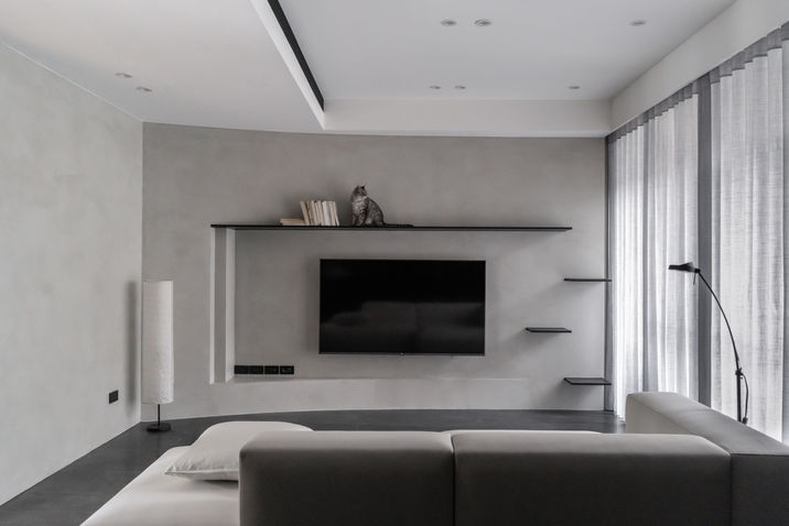 ・客廳以黑白為輔,灰色塗料牆為主,弧形電視牆及天花板得以修飾樑柱問題,也為空間增添更多層次。