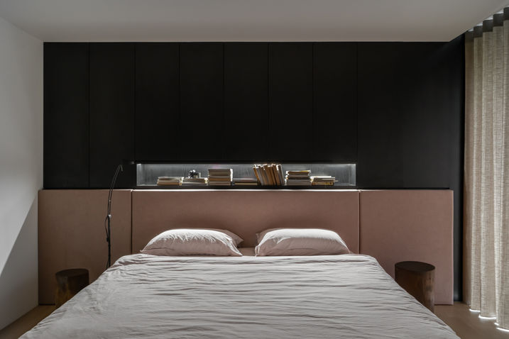 ・主臥以粉色為跳色,主浴的粉色鋁百葉簾也成了特殊角色,床尾之電視矮櫃結合貓砂櫃,房門開貓洞讓寵物隨心進出客廳。